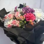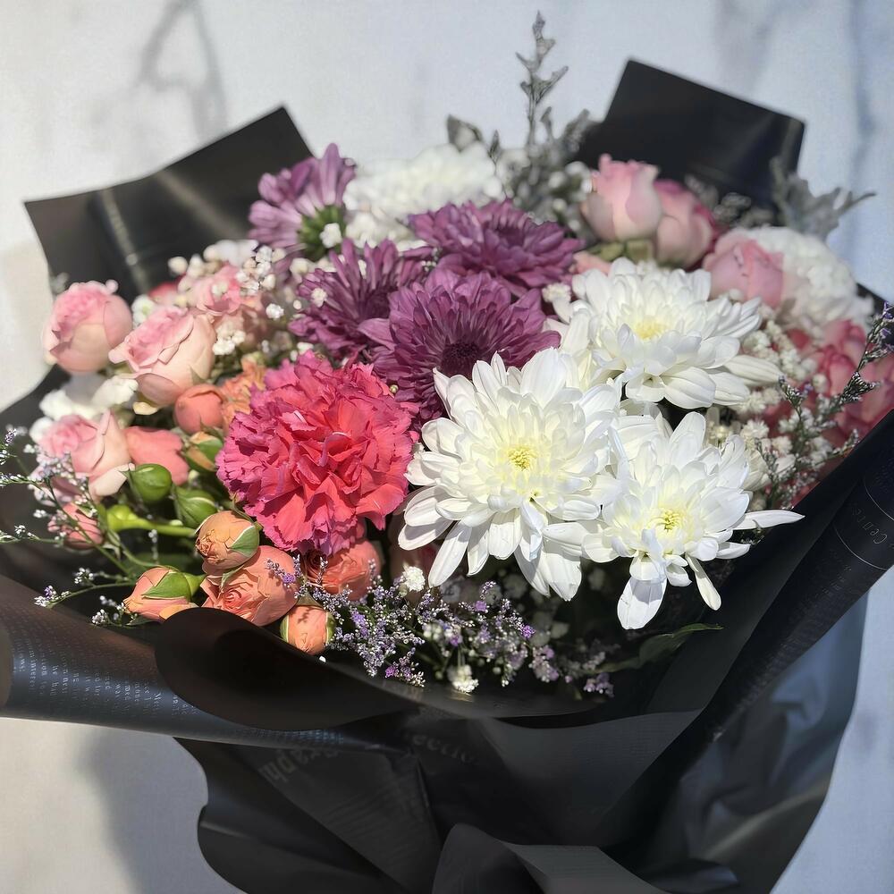 Bouquet bursts with a joyful mix of colors and textures, combining the freshness of white and purple chrysanthemums, the romantic charm of pink and peach roses, and the lively energy of carnations. Accented with airy baby’s breath and soft statice, this bouquet is wrapped in elegant black paper for a modern, striking presentation