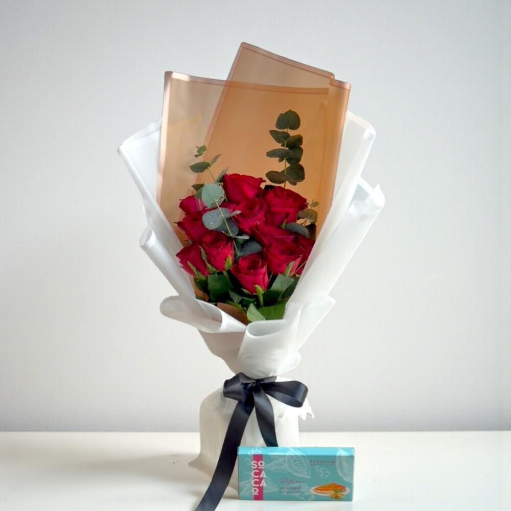 An exquisite pairing of Dubai’s viral Pistachio Kunafa Milk Chocolate and a bouquet of 11 fresh red roses. Indulge in the rich, nutty flavor of premium chocolate combined with the delicate beauty of roses—a perfect gift to express love, luxury, and unforgettable moments.