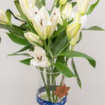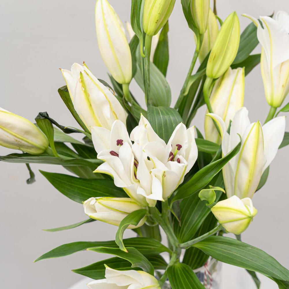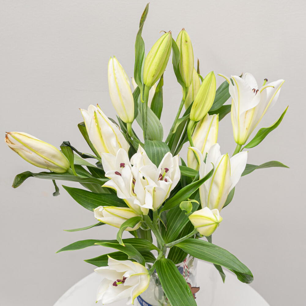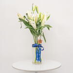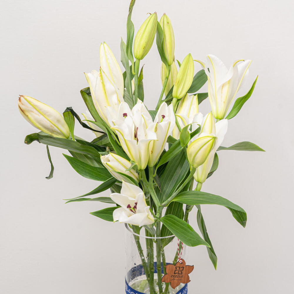 Elevate your interior with this elegant arrangement of delicate white lilies beautifully presented in a 15*30 cylinder. Comprising 10 exquisite blossoms, this chic floral piece not only adds a touch of luxury to your space but also infuses a refreshing aroma that uplifts the ambience. Place it in your living room, bedroom, or even your office to create an environment of tranquility and sophistication. Being versatile and stylish, it makes for a thoughtful gift to your loved ones as well. With these lilies, transform any ordinary space into an extraordinary one!