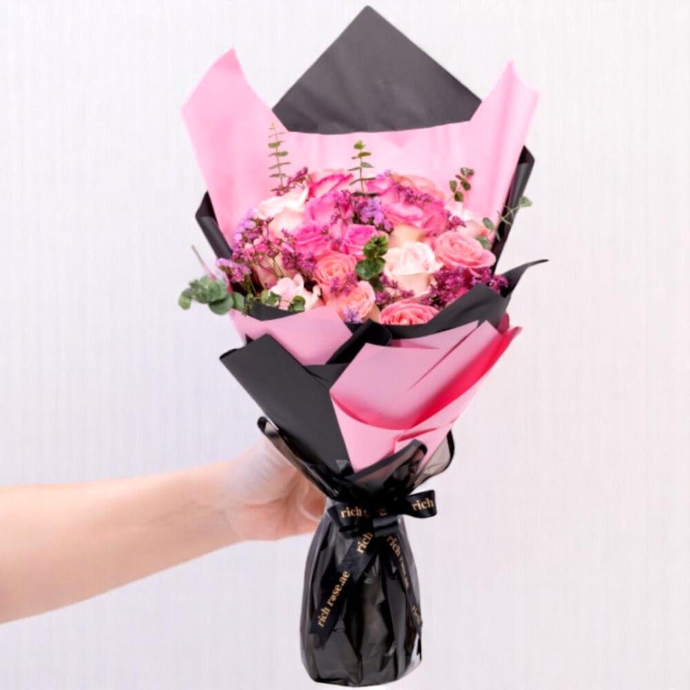 This elegant bouquet is a stylish mix of soft romance and bold charm. Wrapped in luxurious black and pink paper, it features lush roses, delicate spray roses, and vibrant accent blooms in shades of pink and purple. Perfect for birthdays, romantic gestures, or simply brightening someone’s day. To keep your bouquet fresh, place it in clean, cool water, trim the stems diagonally every 2–3 days, and avoid direct sunlight or heat. Refresh the water regularly to prolong freshness. Its graceful colors and refined greenery will bring joy and elegance to any space.