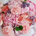 pink carnations - 3 pcs pink hydrangea - 2 pcs sweet sara spray rose - 4 pcs purple statis - 2 pcs eucalayptus - 2 pcs premium pink wrapping - 3 pcs white tissue paper wrapping - 2 pcs