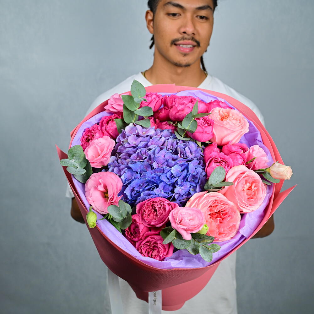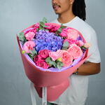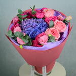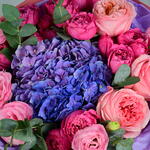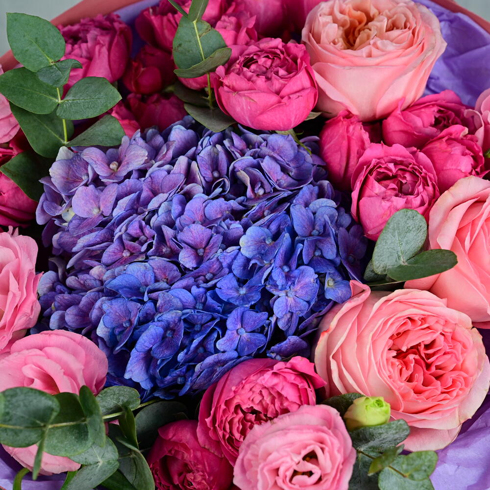 Eucalyptus - 3 pcs hydrangea blue - 1 pcs lisianthus pink - 4 pcs pink expression - 3 pcs spray peony roses cerise - 5 pcs