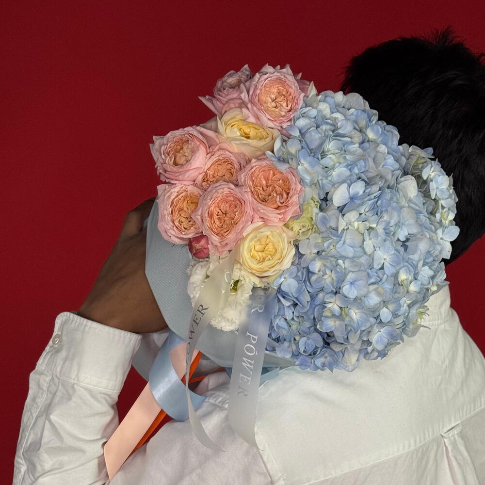 A dreamy small bouquet featuring a serene mix of light blue hydrangeas, fresh roses, delicate spray roses, and elegant eustomas. This Powder Bloom arrangement offers a charming and gentle gesture—a perfect just because gift or a delightful way to brighten any day.