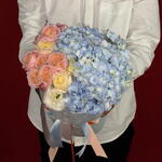 Eustoma - 2 pcs roses - 2 pcs spray roses - 2 pcs hydrangeas light blue - 1 pcs