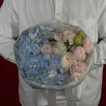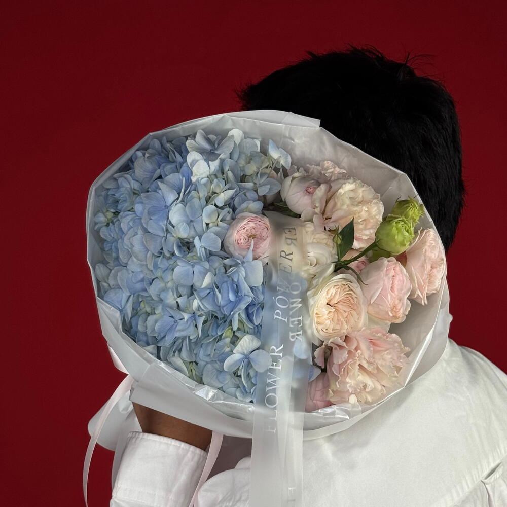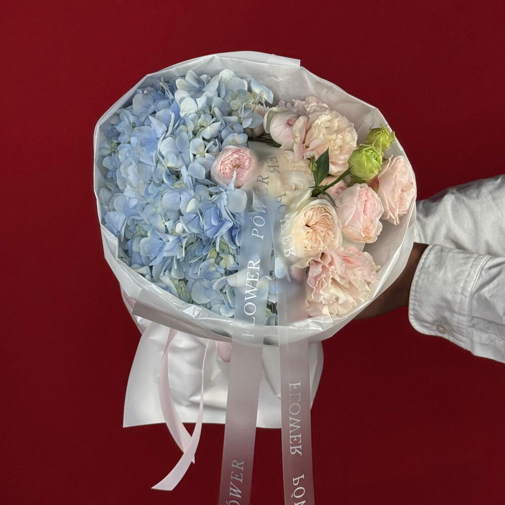 A serene and elegant small bouquet featuring powder blue Hydrangeas, delicate Roses, Spray Roses, and Eustoma. This captivating arrangement offers a soothing blend of soft textures and unique colors—a charming and thoughtful Just Because gift or a lovely addition to any special occasion.