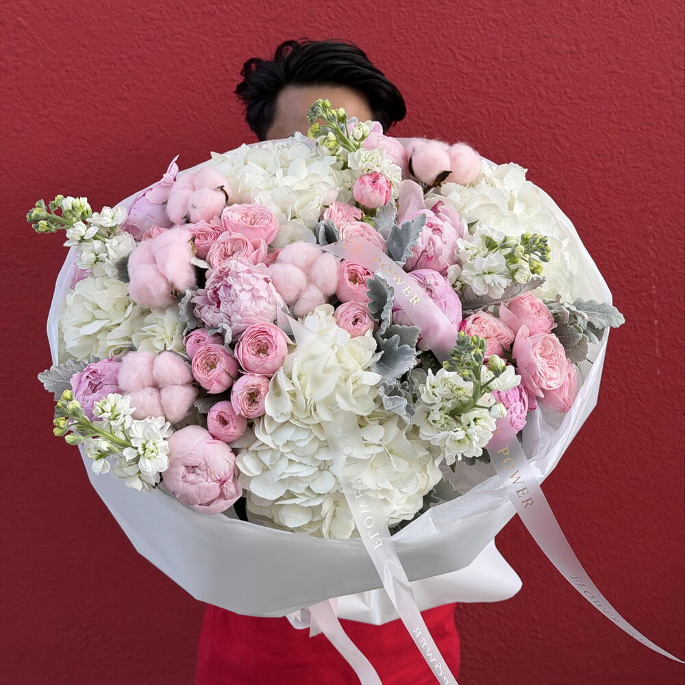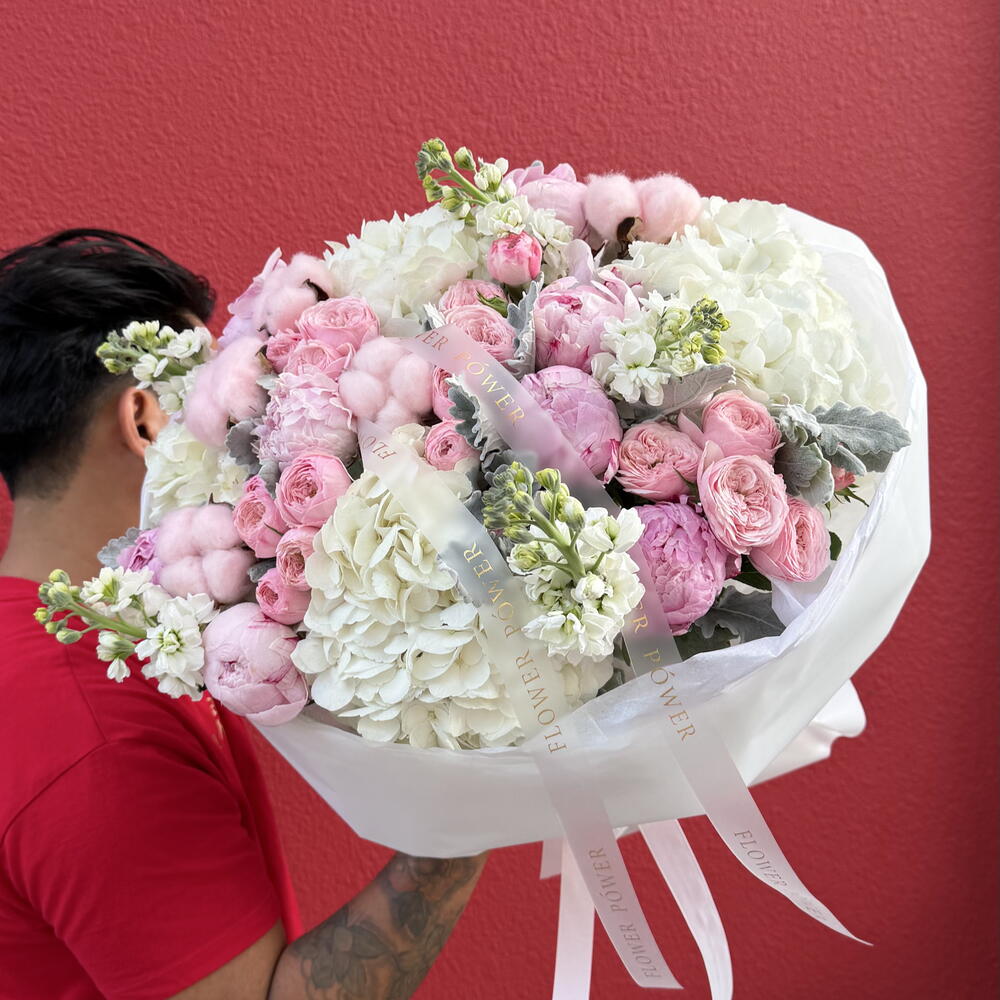 Powdered Grace is an elegant and airy bouquet that blends softness with refined luxury. Fluffy white hydrangeas create a voluminous base, complemented by romantic pink peonies and delicate garden roses. Cotton stems add a modern, textured touch, while silver foliage enhances the bouquet with subtle contrast and depth.