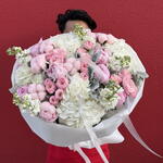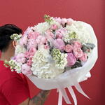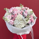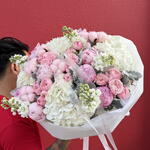 pink peonies - 9 pcs white hydrangeas - 4 pcs pink garden roses - 10 pcs matiola white - 5 pcs maritime - 5 pcs
