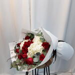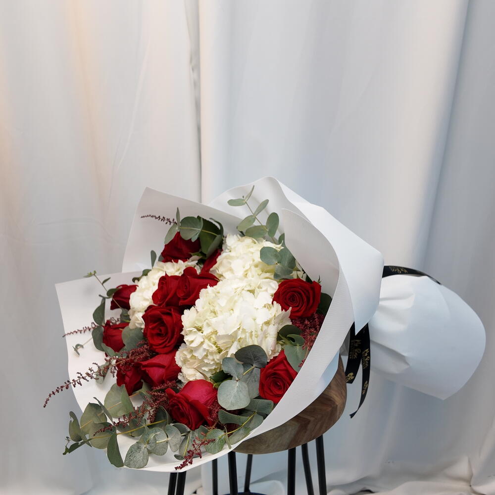 Immerse yourself in the embrace of passionate love with our special florists collection. This bouquet boasts 25 resplendent red roses, symbolizing a deep and enduring affection that speaks louder than words. Nestled among the roses are 3 pristine white hydrangeas, which add a soft touch of elegance and purity. The arrangement also features 5 red astilbes, dancing amidst the blooms with their delicate and playful charm, and 4 eucalyptus branches that infuse the bouquet with a hint of refreshing aroma. Perfect for declarations of love, anniversaries, or simply to bring a smile to someones face.