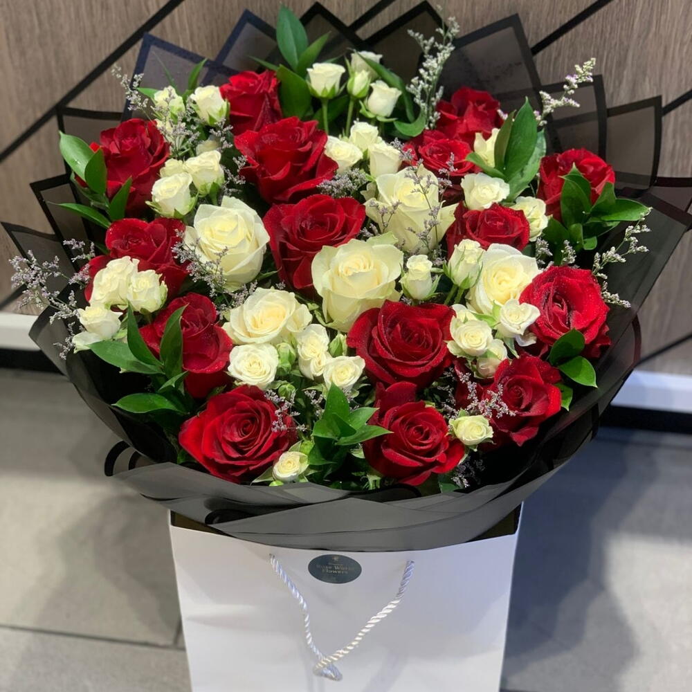 Red rose - 15 pcs Ruscus - 10 pcs Limonium - 5 pcs White rose - 5 pcs baby rose white - 10 pcs