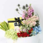 1500 Gms Patchi Chocolate 1 Green Hydrangea 1 Blue Hydrangea 2 Pink Oriental Lilly 5 Pink Matthiola 4 Baby Red Rose 10 Sweet Pink Rose 2 Stems Eryngium Leaves - 1 Song of India, 1 Eucalyptus and 10 Steel Grass Beautifully Arranged in Buy Any Flowers Box