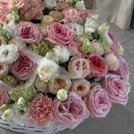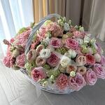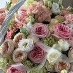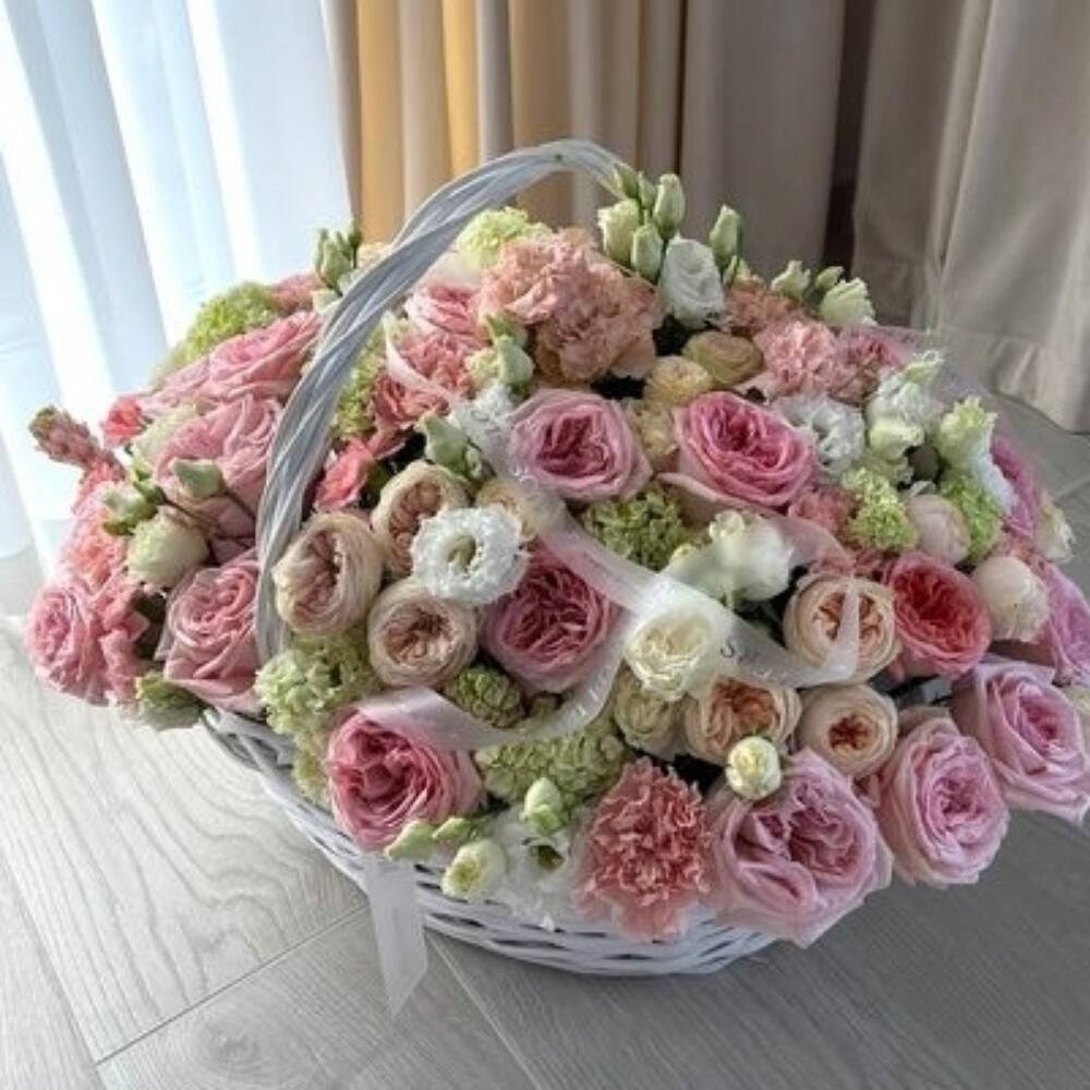 Basket - 1 pcs dianthus pink - 25 pcs pink o'hara - 25 pcs rebbon - 2 pcs The text "liziantuz" does not appear to be a valid word or phrase in any language, and it seems to be a typographical error or a misspelling. If it is intended to refer to "lisianthus," a type of flower, the translation would be: lisianthus - 20 pcs dianthus green - 10 pcs roses of hope - 10 pcs baby pink peonies - 15 pcs bebe rose cream - 10 pcs