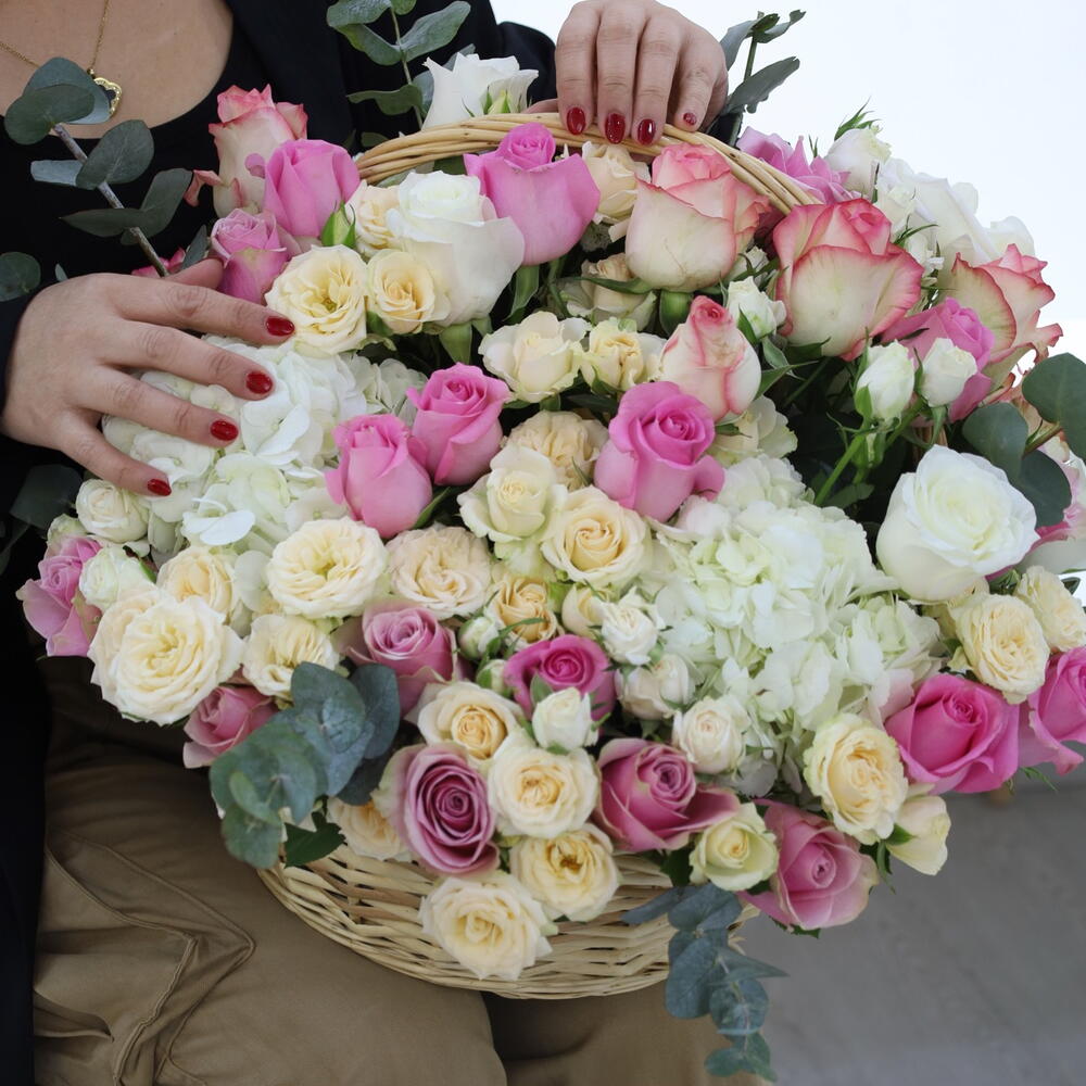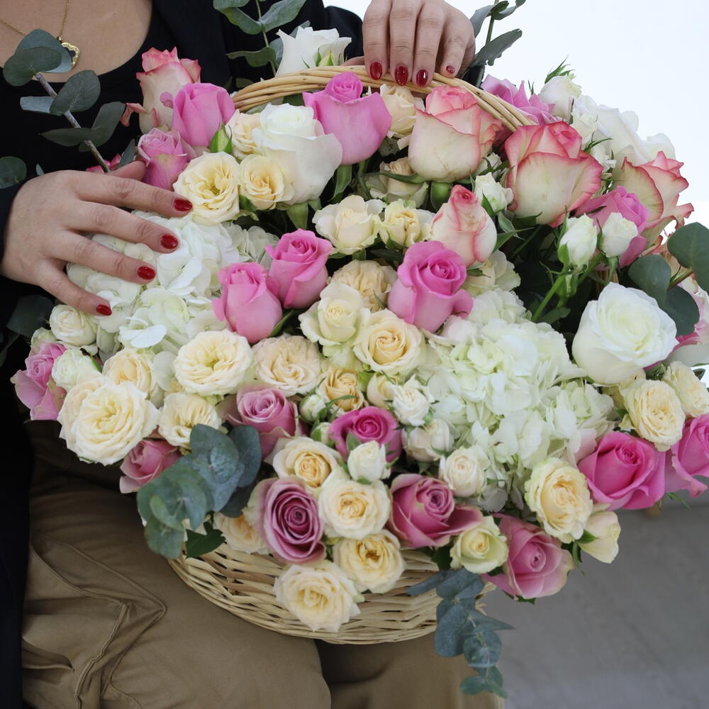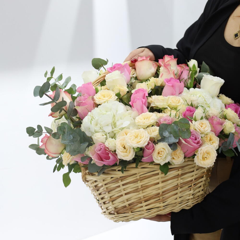Basket - 1 pcs white hydrangea - 3 pcs premium pink rose - 10 pcs premium purple rose - 10 pcs spray rose senterio - 5 pcs