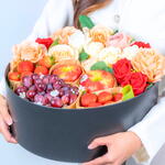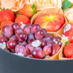 Pink rose - 1 pcs strawberry - 300 g red roses - 5 pcs peach roses - 5 pcs white roses - 5 pcs red grapes - 300 g envy apples - 2 pcs black box large - 1 pcs