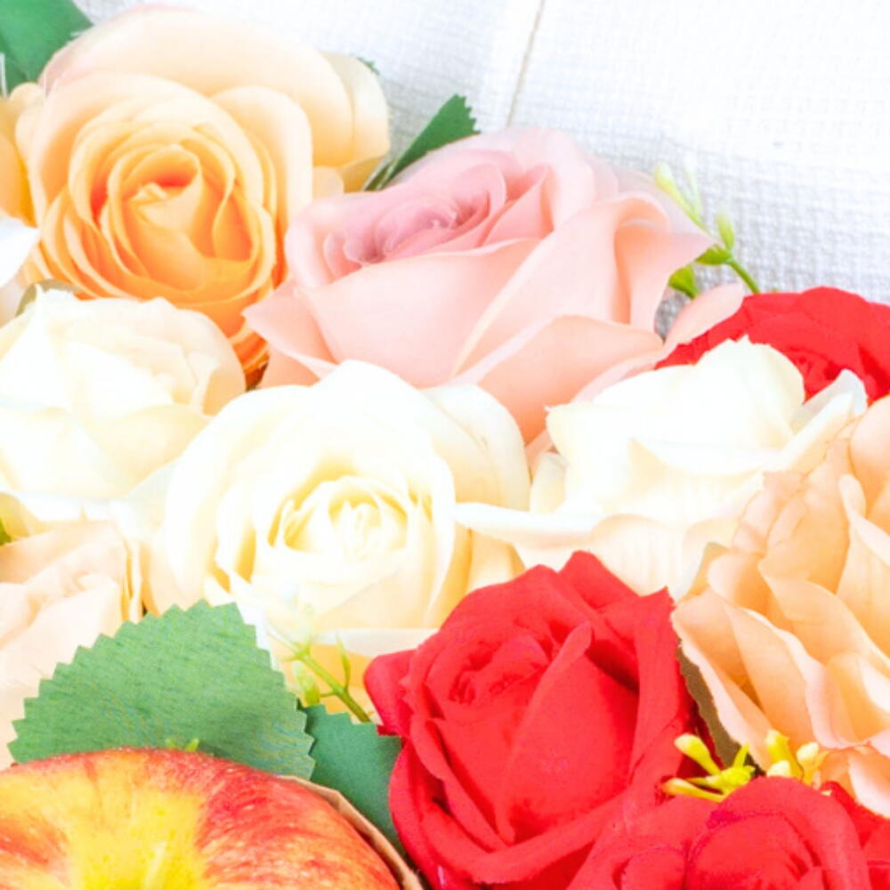 Pink rose - 1 pcs strawberry - 300 g red roses - 5 pcs peach roses - 5 pcs white roses - 5 pcs red grapes - 300 g envy apples - 2 pcs black box large - 1 pcs