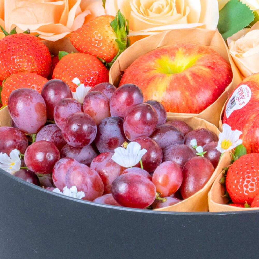 large, round, black gift box filled with a decorative arrangement of fresh fruits and flowers. The box contains red roses along one side, with strawberries, blueberries, grapes, and small apples with golden ribbons filling the rest of the space