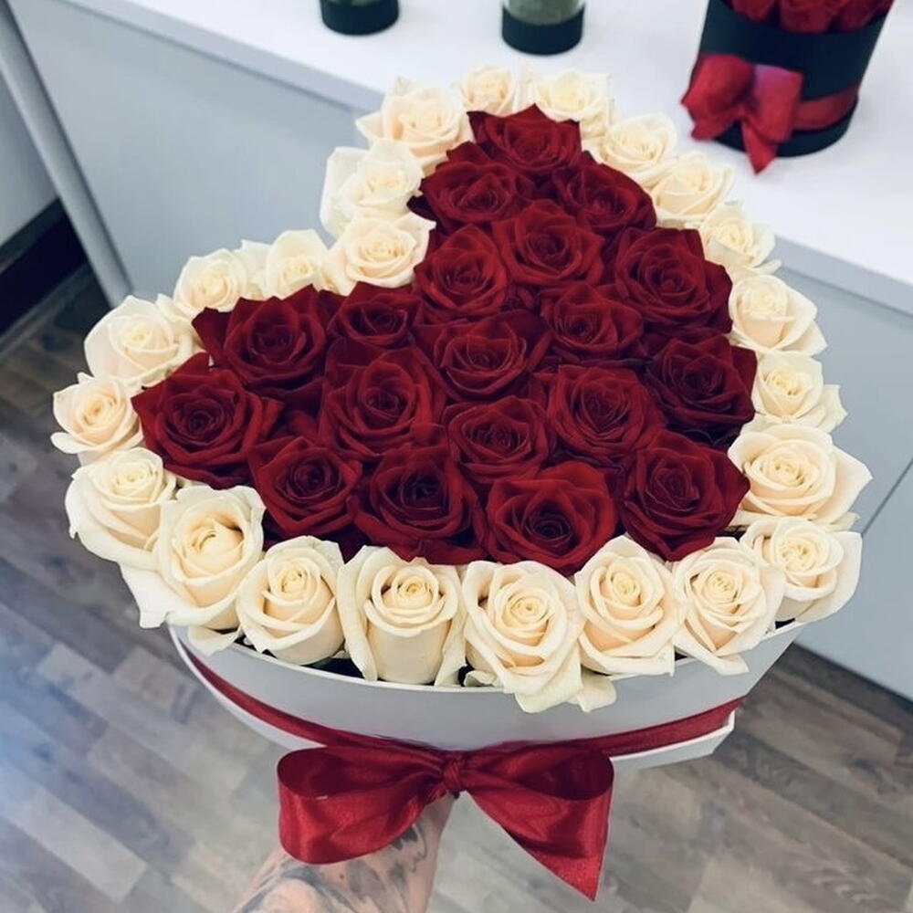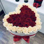 Red ribbon - 1 pcs heart box - 1 pcs premium red roses - 25 pcs premium white roses - 25 pcs