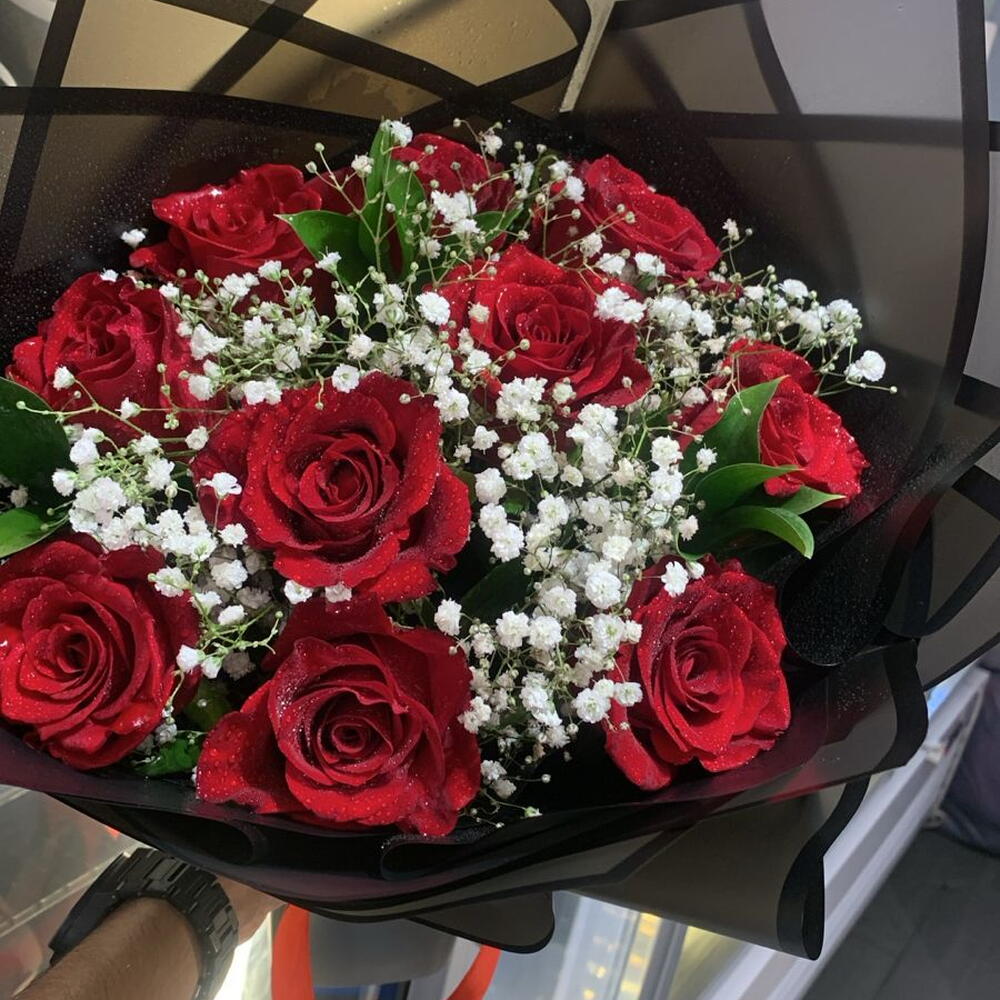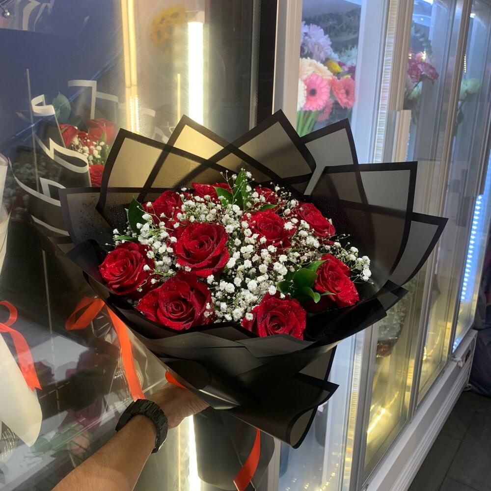 Red rose - 10 pcs Ruscus - 3 pcs gypsum - 4 pcs