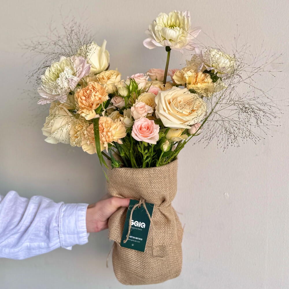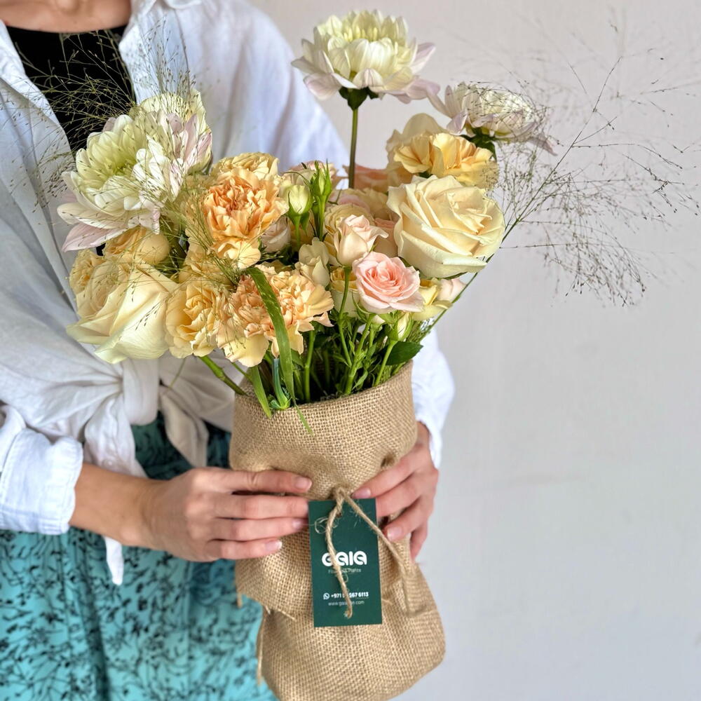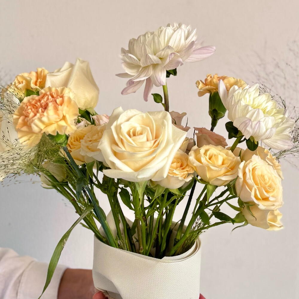 Elevate your gifting with this uniquely luxurious and airy arrangement. We have masterfully blended the bold, structural beauty of white Dahlias with the creamy perfection of Vendela roses. Accented with delicate peach carnations and the whimsical, dancing texture of Panicum Fountain grass, this bouquet offers an attention-grabbing silhouette. 👀😍 🌼 Best For: Sophisticated Birthdays, Elegant Housewarmings, Corporate Thank You gifts, or an Anniversary surprise. ✨