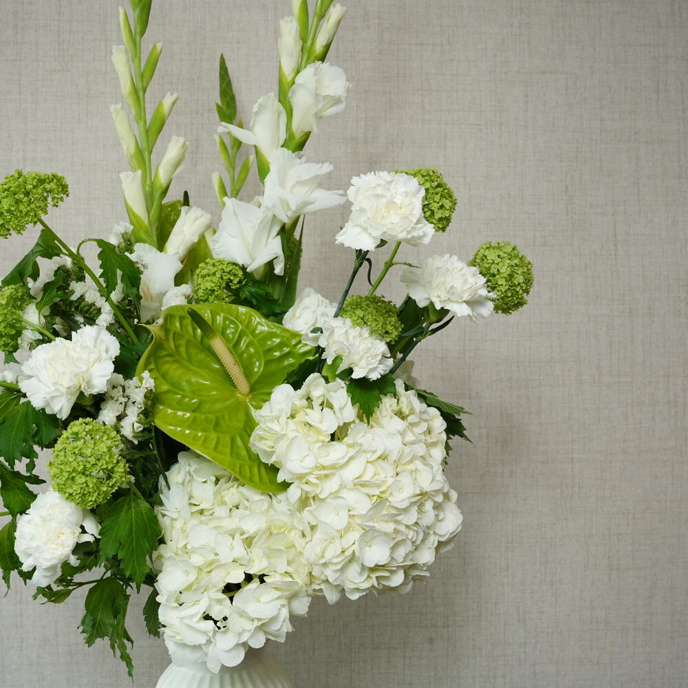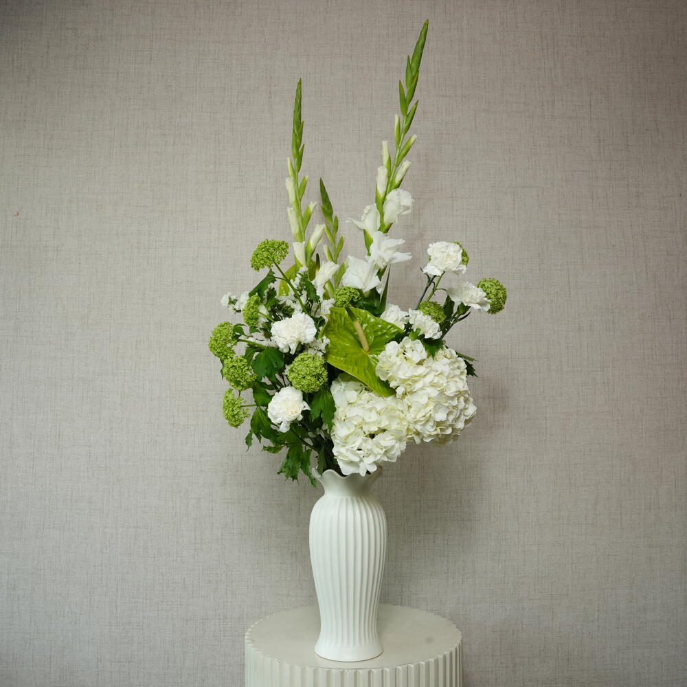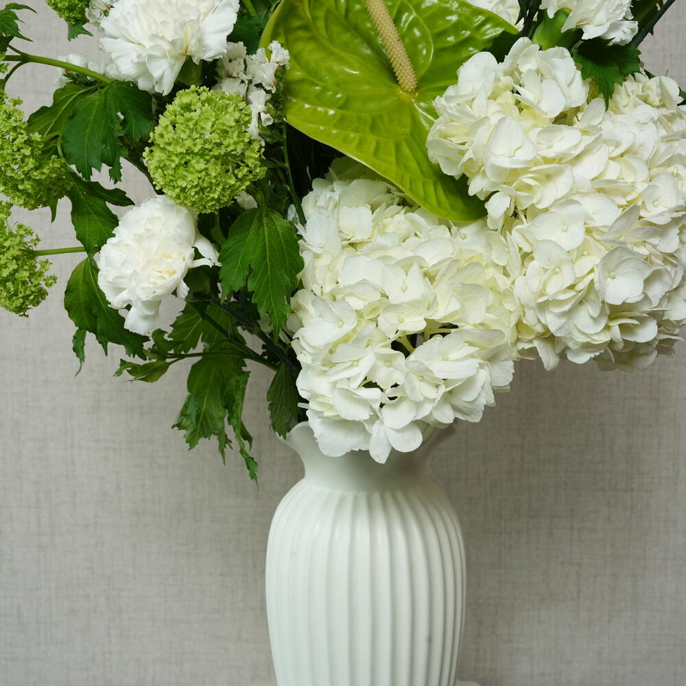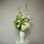 Add a serene touch to your decor with this lush white floral arrangement. A chic mix of seasonal greens and soft blooms in a modern vase.