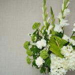 Statice - 6 pcs Hydrangea - 3 pcs Viburnum - 5 pcs Anthurium - 2 pcs gladiolas - 3 pcs carnation - 10 pcs ceramic vase - 1 pcs