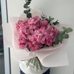 Bouquet of 15 premium pink rose with fillers in a nice wrapping. Elegant bouquet of 15 premium pink roses with delicate fillers, beautifully wrapped for a charming presentation. Perfect for expressing love, admiration, and appreciation on special occasions. 15 pink rose bouquet, premium rose arrangement, romantic floral gift, fresh flower delivery. Trim stems and place in clean water, keeping the bouquet away from direct sunlight and heat. Change water daily and remove wilted petals to maintain freshness.