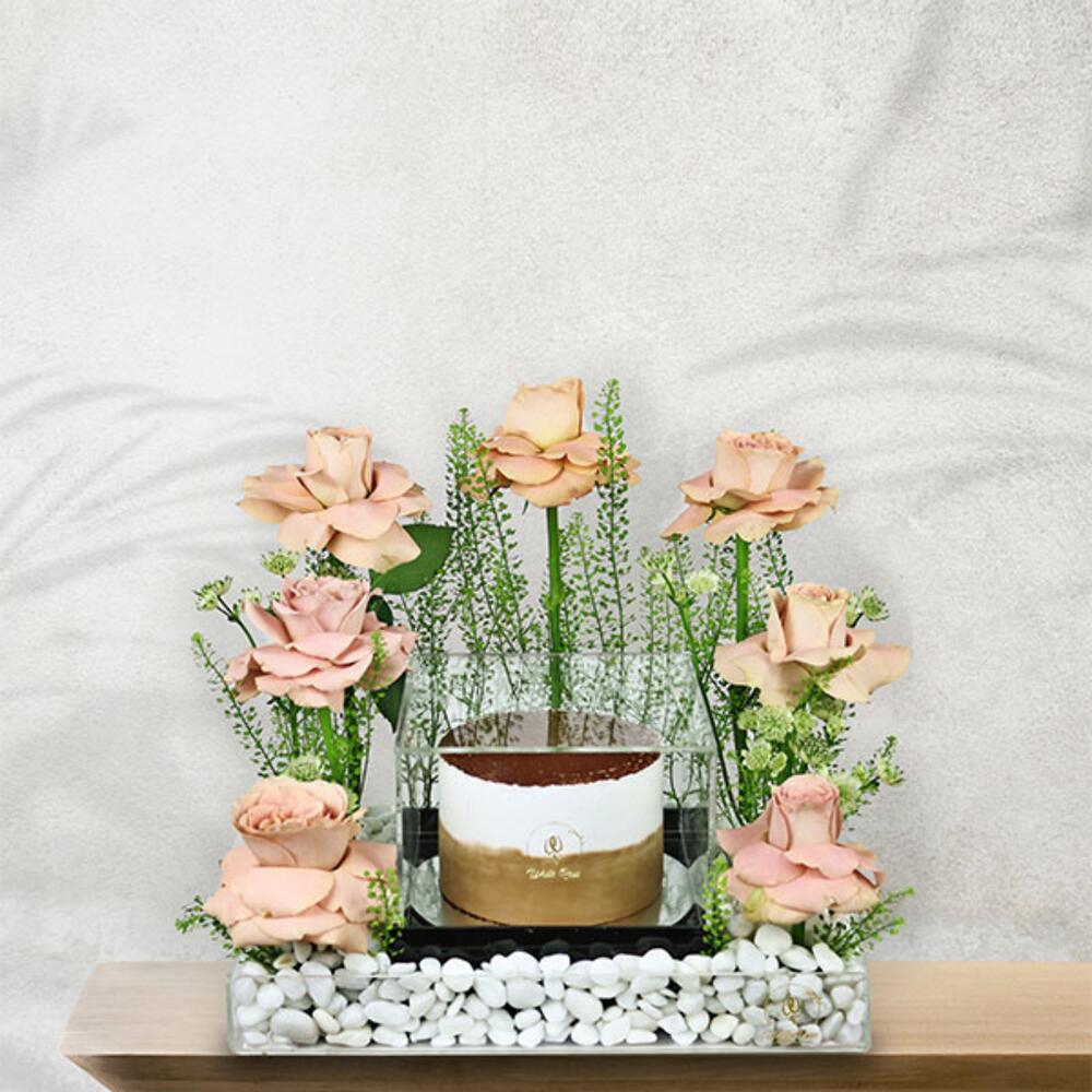 cappuccino Roses and fillers with 300g cake in an Acrylic tray