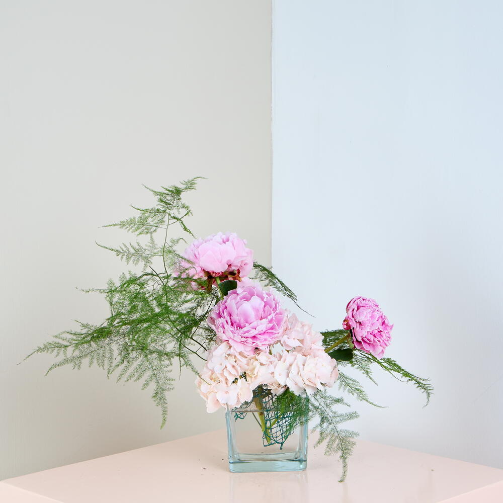 Hydrangea - 1 pcs Vase - 1 pcs Peony - 3 pcs asparagus - 5 pcs