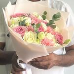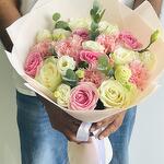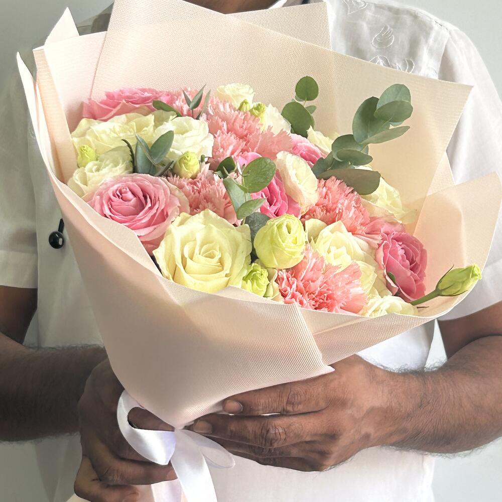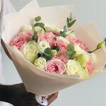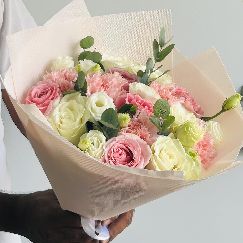 carnation pink - 5 pcs wrapping paper - 3 pcs lisanthus white - 3 pcs white roses - 5 pcs wham pink roses - 5 pcs euclayptus - 2 pcs