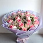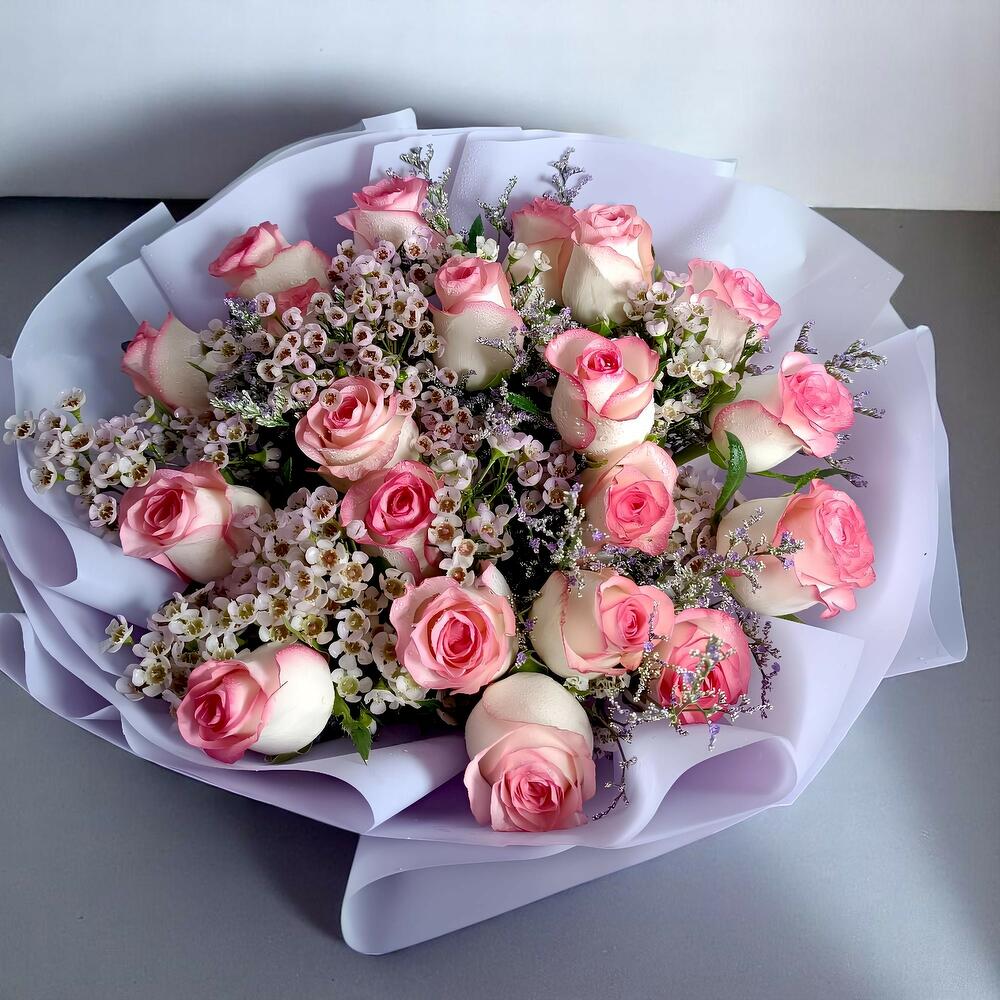 Soft, dreamy, and perfectly romantic—this elegant Pink roses bouquet is a premium Rose bouquet / Rosses bouquet made with beautiful two-tone pink roses (creamy petals with bright pink edges) paired with delicate fillers like wax flower and airy greenery (fillers may vary slightly by season while keeping the same look and feel). Wrapped in stylish lilac paper and finished with a satin ribbon, it has a gentle Pastel Color bouquet vibe and a classy Mono bouquet feel—crafted as a Fresh flowers bouquet (Fresh bouquet) using premium quality and premium quality flowers. A true Premium flowers bouquet that’s clean, full, and photo-ready. Perfect as a Birthday Bouquet and a strong pick for the best birthday bouquet—ideal for Birthday flowers, Flowers for birthday, and thoughtful Birthday gifts. It also shines as a Romantic bouquet filled with love and romance flowers, making it one of the best flowers for anniversary. For milestones and special wins, it works beautifully as a Congratulations bouquet with elegant Congratulations flowers too. A stylish cool bouquet that’s always a trending bouquet and a truly unique flowers bouquet—perfect for anyone looking for the best bouquet in dubai.