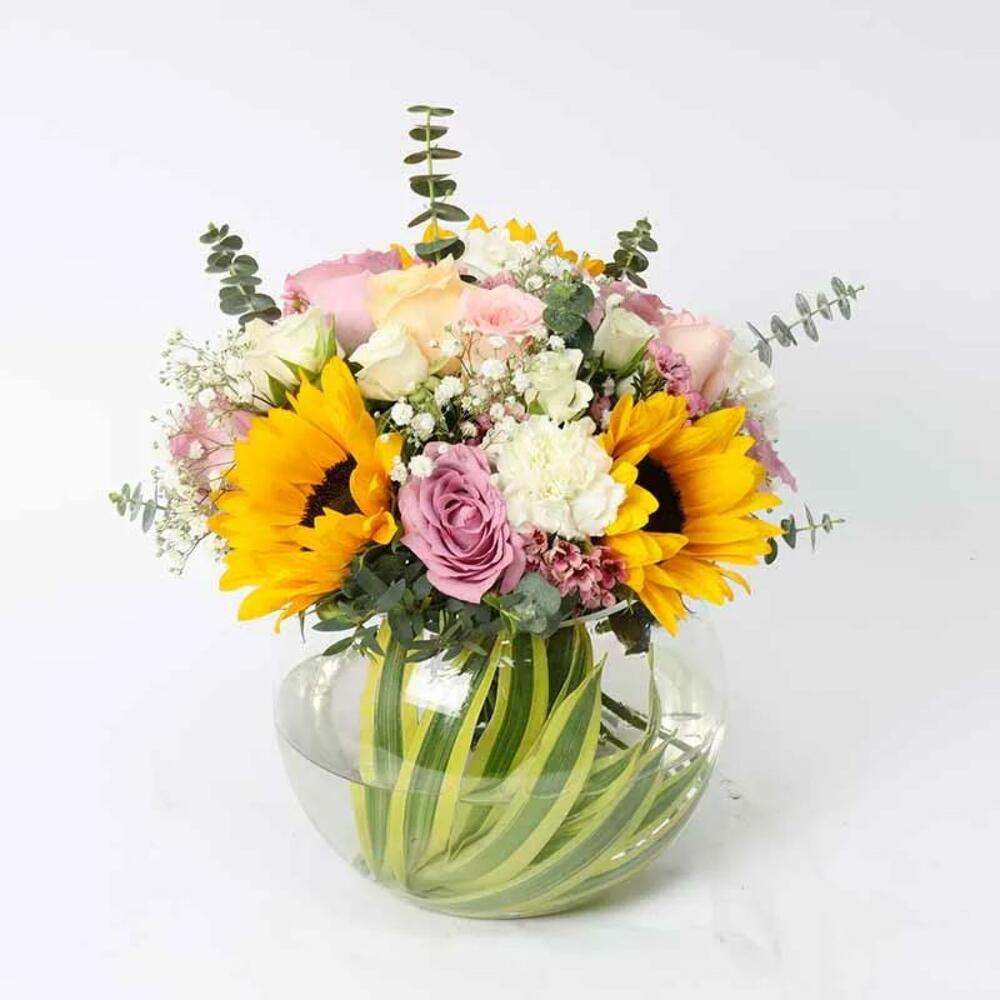 3 Stems Sunflowers 3 Stems Purple Roses 3 Stems Peach Roses 3 Stems Pink Roses 3 Stems White Carnations 2 Stems White Baby Roses 1 Stems Pink Wax Leaves and Fillers - 2 Stems Eucalyptus, 1 Stem Gypso and 1 Song of India Beautifully Arrange d in a fish bowl