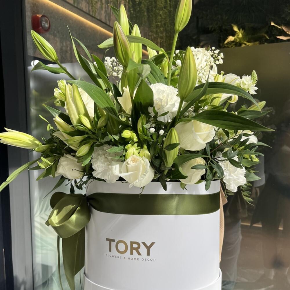 Composition: Rose white - 10, Lily - 5, Pistacia - 2, Gypsophila - 3, Chrysanthemum spray mix - 3, Dianthus mix - 5, Branded round box - 1 Sizes: WIDTH - 30CM; HEIGHT - 35CM; LENGTH - 35CM; (including packaging) Size: 30 x 35 x 35 cm