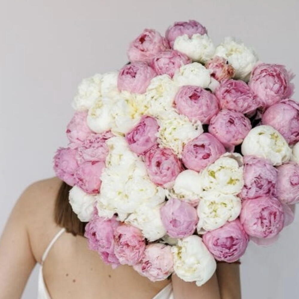 A luxurious XL mono-bouquet composed of 50 fresh, voluminous peonies. The rounded, cloud-like arrangement creates a soft and sophisticated floral silhouette that feels both elegant and breathtaking. Each peony is carefully selected for its fullness, texture, and quality, ensuring a rich and refined visual impression. The bouquet is arranged with perfect balance and natural airiness, highlighting the delicate beauty of every bloom.