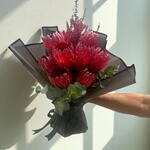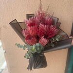 protea red - 10 pcs astelbe - 5 pcs in a bqt black warpping - 5 pcs
