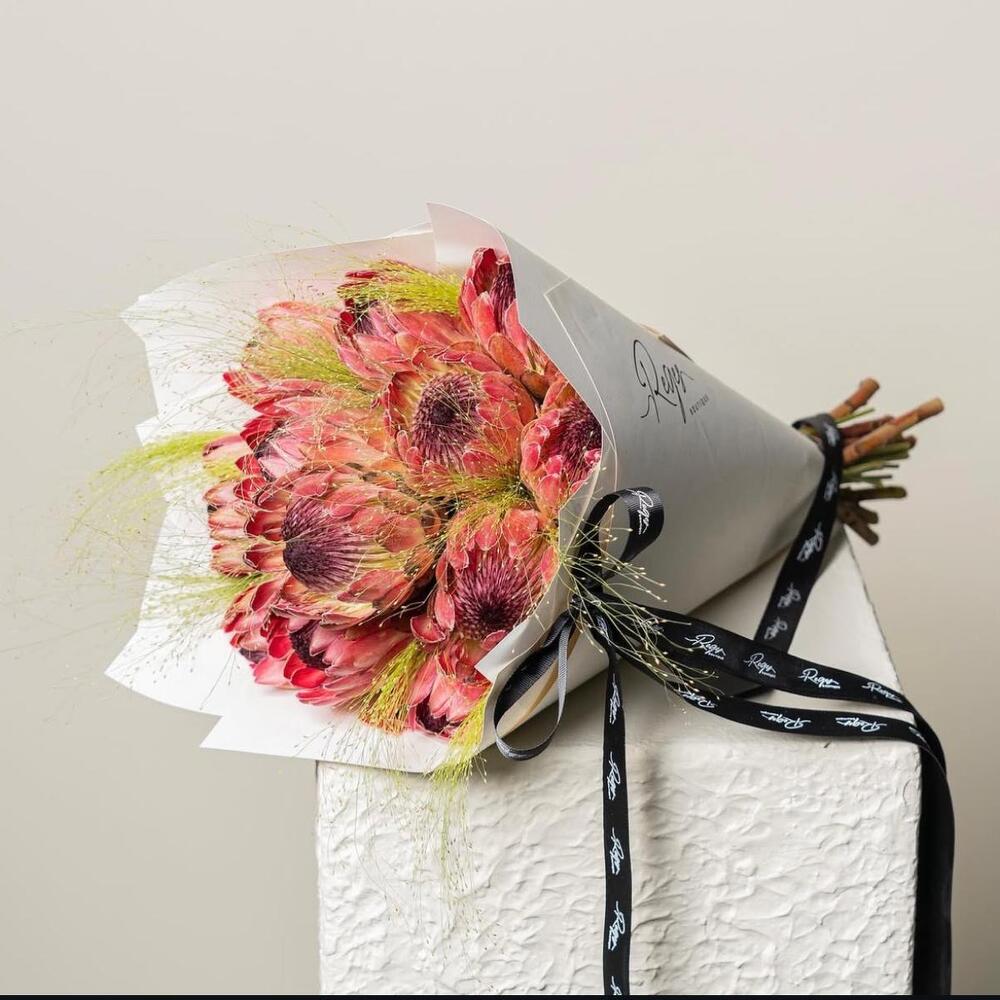 This exquisite Florists Special features a luxurious ensemble of 14 premium big Proteas, artistically arranged and carefully wrapped in five sheets of quality wrapping paper. The package is tastefully completed with a chic ribbon and comes conveniently packed in an elegant paper bag. Whether youre expressing your love, saying thank you or just want to make someones day special, this flawless bouquet is sure to impress with its natural beauty and sophisticated presentation.
