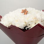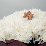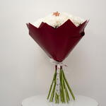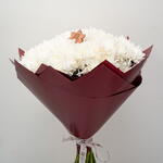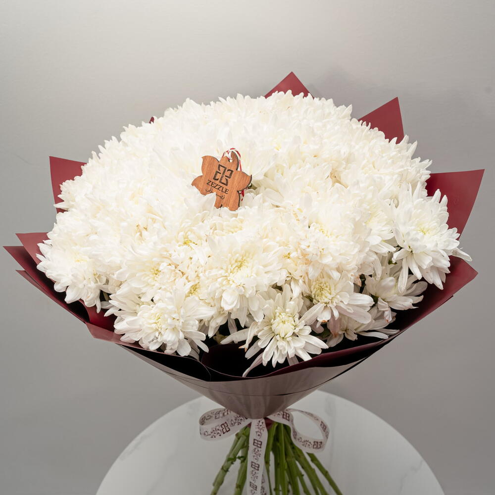 A pure and simple bouquet featuring a stunning array of white chrysanthemums, beautifully wrapped in a sophisticated maroon. This classic arrangement exudes elegance and simplicity, making it perfect for expressing sympathy, gratitude, or simply to brighten someones day.