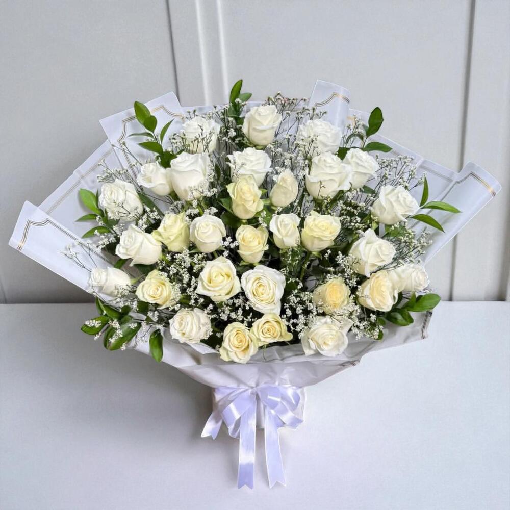 The Pure Elegance Bouquet is a timeless expression of grace and sophistication, designed to make any moment unforgettable. This bouquet combines the soft beauty of premium white roses with the delicate charm of gypsophila (baby’s breath) and fresh greenery. Wrapped in pristine white paper with a satin ribbon, it radiates purity and serenity, making it a perfect gift for weddings, anniversaries, sympathy gestures, or elegant celebrations. The Pure Elegance Bouquet symbolizes purity, sincerity, and everlasting love. Its lush and abundant design makes it a statement piece, whether given as a romantic gesture, a congratulatory surprise, or a graceful way to convey sympathy and respect. The harmony of crisp white roses and delicate gypsophila creates a bouquet that is both classic and contemporary. Care Instructions: Upon receiving the bouquet, trim the stems diagonally and place them in clean, cool water. Refresh the water daily and keep the flowers in a cool environment, away from direct sunlight, heating sources, and ripening fruits. With proper care, your Pure Elegance Bouquet will stay fresh and radiant for days, maintaining its delicate charm.