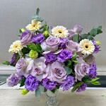 Eucalyptus - 4 pcs purple lisianthus - 6 pcs gerbera peach - 4 pcs purple rose. - 8 pcs