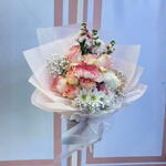 Celebrate love and affection this Valentine’s Day with a charming bouquet featuring 8 pink Esperance roses, white deco chrysanthemums, mathiolla, chrysanthemums, and delicate gypsophila. This elegant arrangement combines soft pink and white blooms, creating a romantic and graceful gift for someone special.