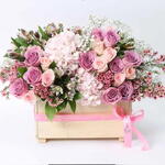Product Details: 2 Pink Hydrangeas 10 Purple Roses 10 Pink Roses 5 White Alstroemerias 2 Stems Purple Wax Tied with a Ribbon Bow Prepared in a Wooden Box Leaves and Fillers - Gypso and 2 Single Ruscus