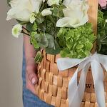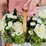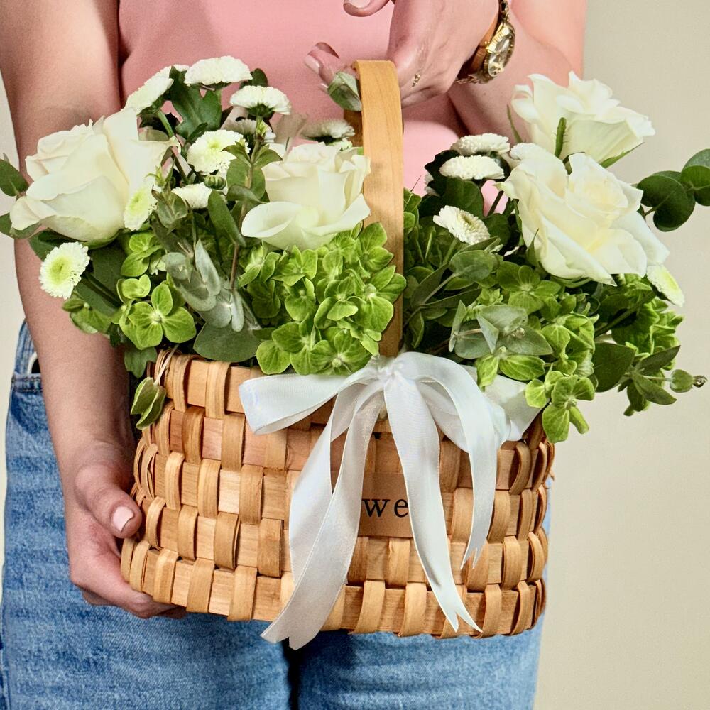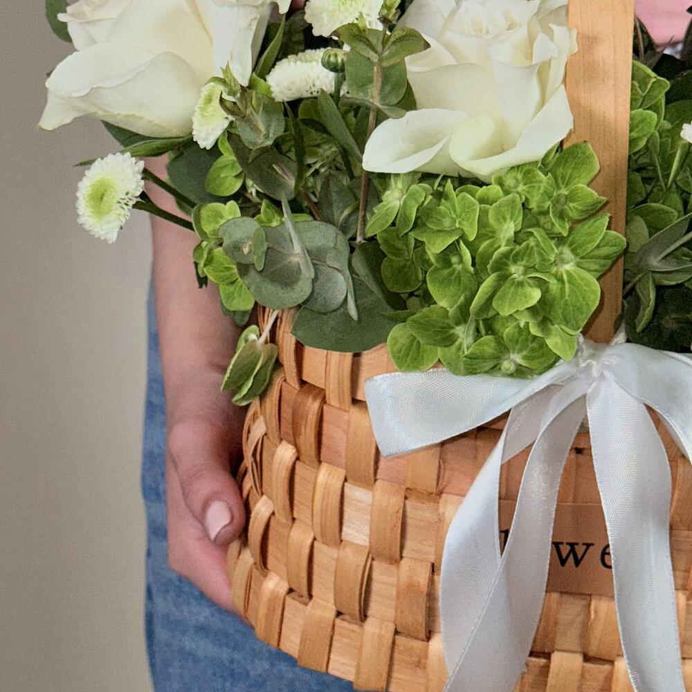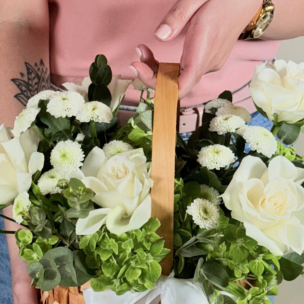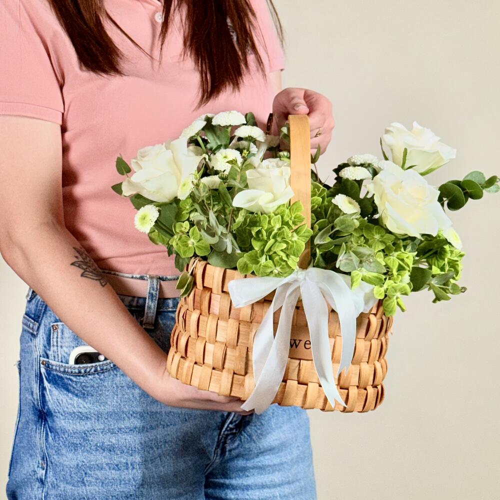 A fresh and elegant flowers basket featuring White Roses (Rosa), Green Hydrangea (Hydrangea), and delicate White Spray Chrysanthemums (Chrysanthemum), finished with fragrant Eucalyptus greenery for a clean, premium look. This timeless white roses bouquet in a basket is perfect as a classy Birthday Bouquet and one of the best birthday bouquet choices for anyone who loves soft, minimal, pastel styling—ideal for birthday flowers / flowers for birthday and thoughtful birthday gifts. Designed as a premium quality flowers arrangement, it’s also a beautiful congratulations bouquet, an elegant wedding flowers arrangement, and one of the best flowers for anniversary or best flowers for newborn celebrations. If you’re looking for the best bouquet in Dubai, this mixed flowers bouquet with White Roses (Rosa) + Green Hydrangea (Hydrangea) + White Spray Chrysanthemums (Chrysanthemum) + Eucalyptus is a cool, romantic, and trending choice.