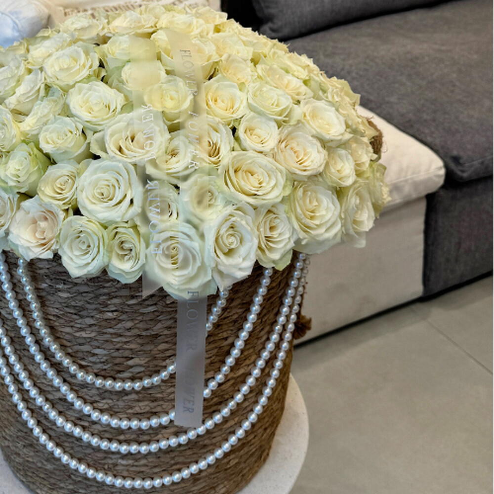 Basket - 1 pcs white roses - 150 pcs pearl strands - 4 pcs