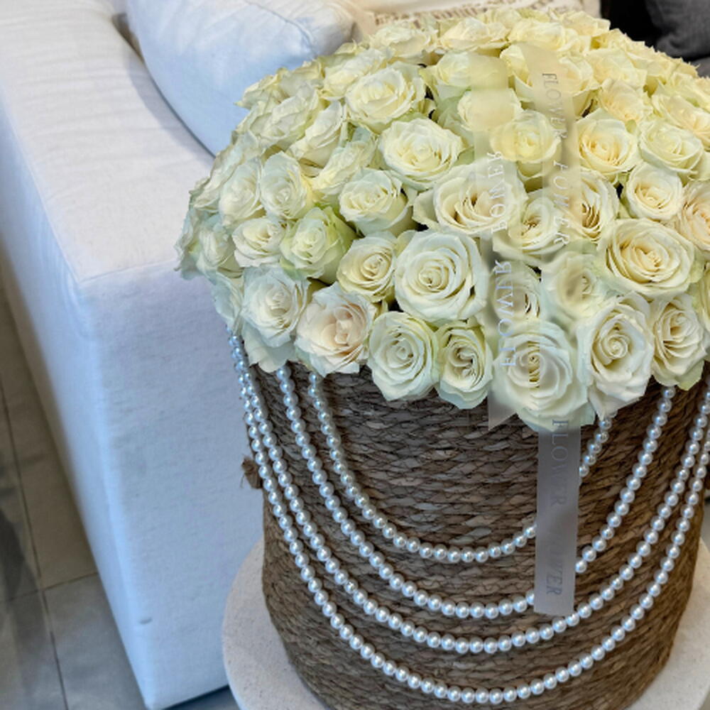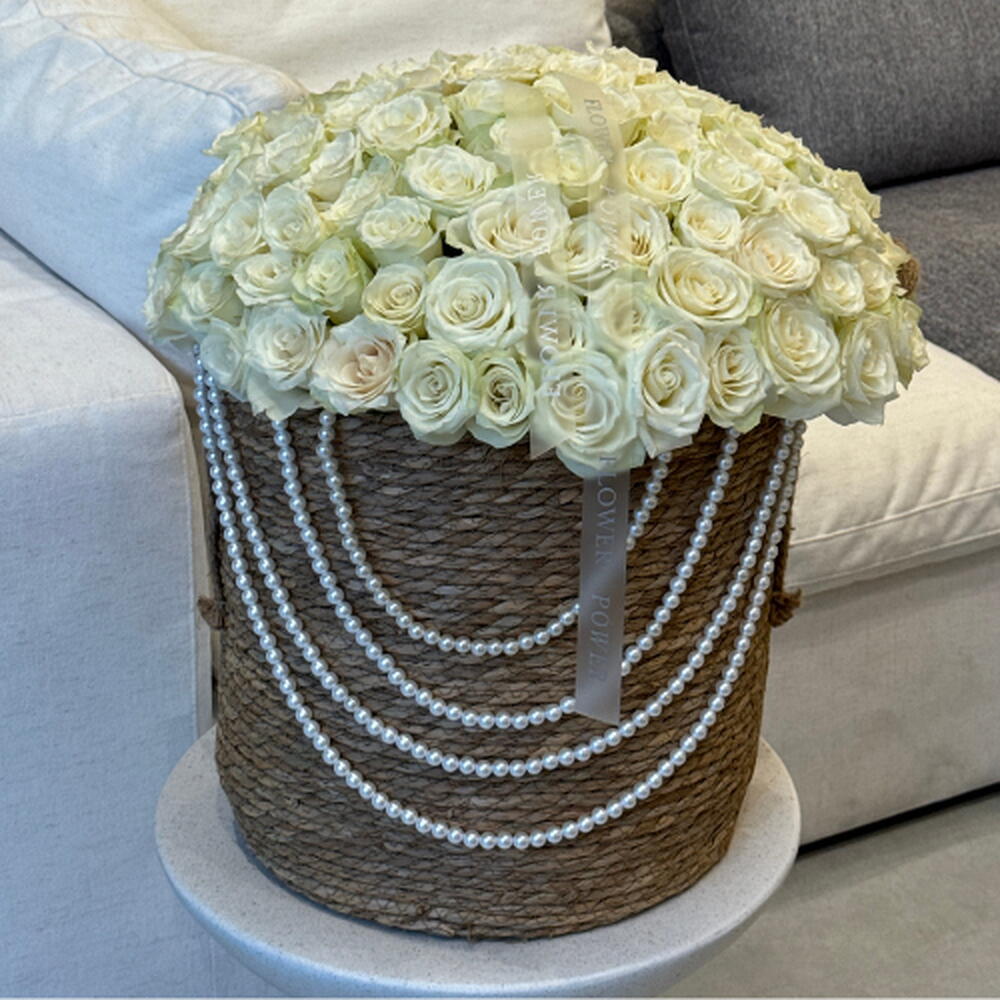 Exude timeless grace with our Pure Pearl arrangement. This exquisite design features velvet-soft white roses nestled in a bespoke basket, delicately adorned with shimmering pearls. A symbol of purity and refined taste, it is the ultimate choice for weddings, milestones, or an unforgettable romantic gesture.