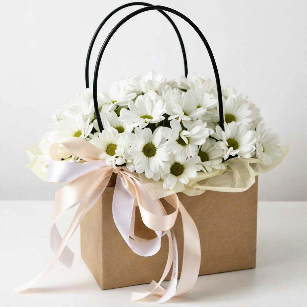 A pure white classic simple, elegant, always right. Graceful, fresh, and effortlessly elegant — this refined floral gift features pure white daisies arranged beautifully in a premium kraft flower bag, finished with a soft satin ribbon for a timeless look. Symbolizing purity, peace, and heartfelt warmth, this bouquet is perfect for birthdays, thank-you gifts, get-well wishes, housewarmings, or elegant everyday gifting. Its clean white palette and minimalist presentation make it a favorite for modern tastes and instant decisions. Freshly crafted and thoughtfully styled, this is a gift that feels calm, classy, and sincerely beautiful.