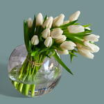 A modern arrangement featuring a bouquet of white tulips, artfully displayed in a clear, rounded glass vase. The tulips are arranged to create a cascading effect, with their stems tied together with natural twine, showcasing the simple elegance and purity of these flowers.