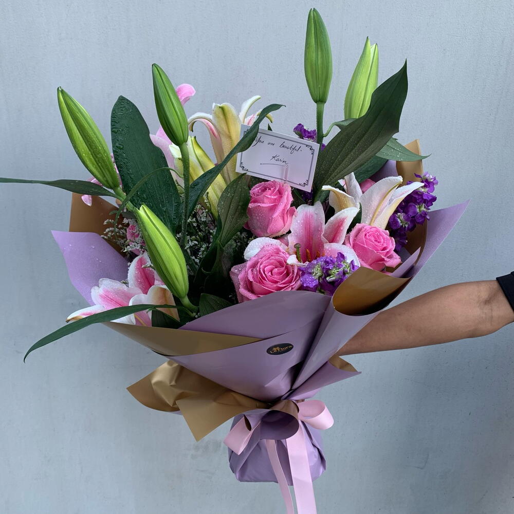 Pink rose - 6 pcs pink lily - 3 pcs fillers - 6 pcs