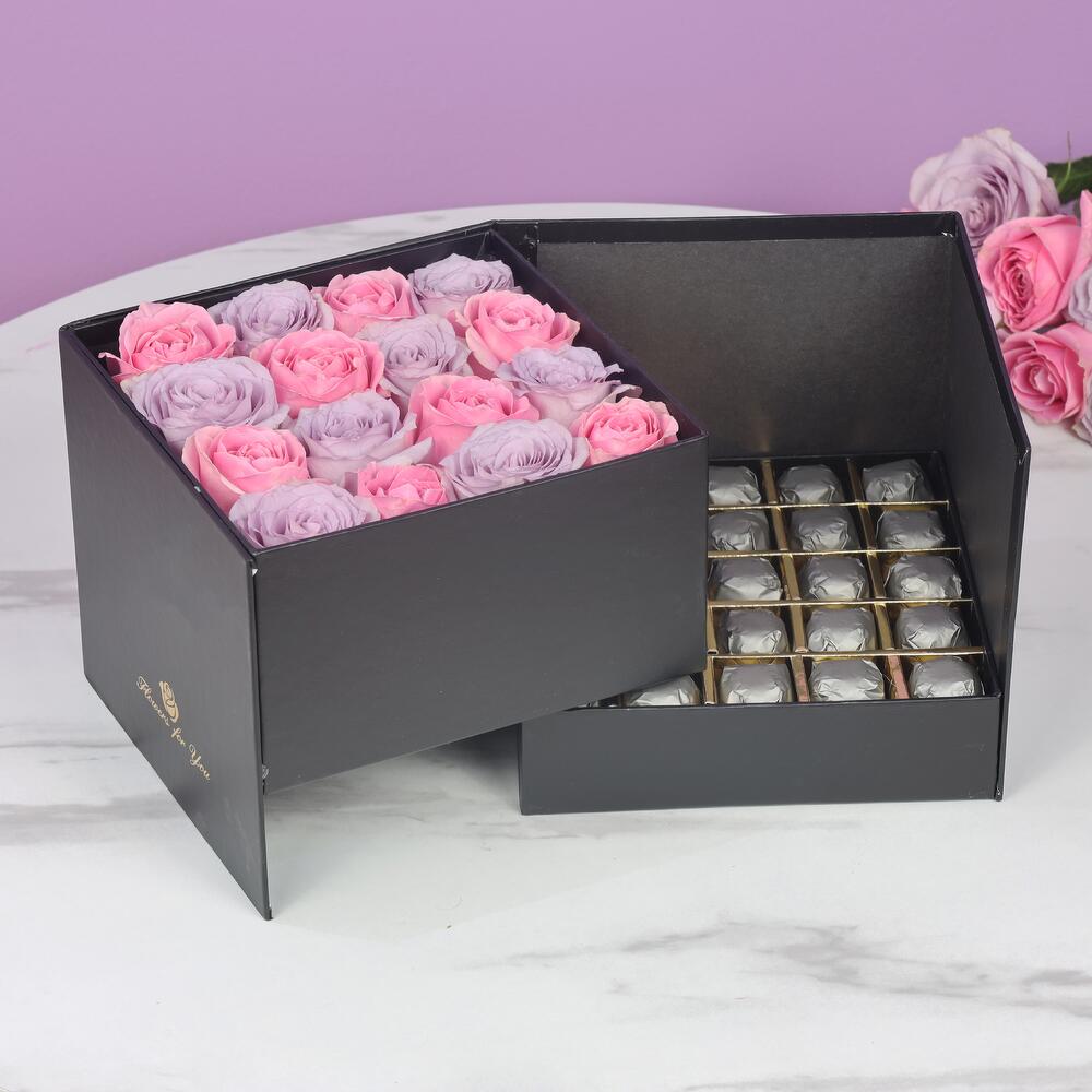 8 Ocean Purple Roses, 8 Wham Pink Roses, 25 Pcs Bajio Milk Chocolates with Hazelnut By Sweecho, Arranged in a Designer Black Square Box.