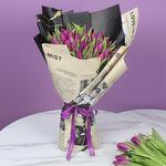 51 Purple Tulips, Beautifully Wrapped in Off White Love in Mist and Black Golden Marble Wrapping, Tied with Purple Ribbon.