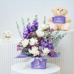 Sweecho 250gm Premium Chocolate 25cm You Are Amazing Teddy 5 Purple Mathiola 6 White Roses 2 Stems Purple Wax 1 Stem Eucalyptus 2 Stems Ruscus Arranged in Square Glass Vase 12×12 cm