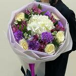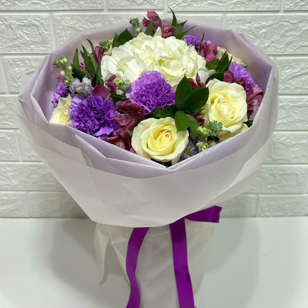 Alstroemeria - 4 pcs rose - 5 pcs carnation - 5 pcs white hydrangea - 1 pcs matholia - 3 pcs