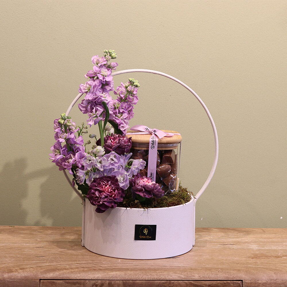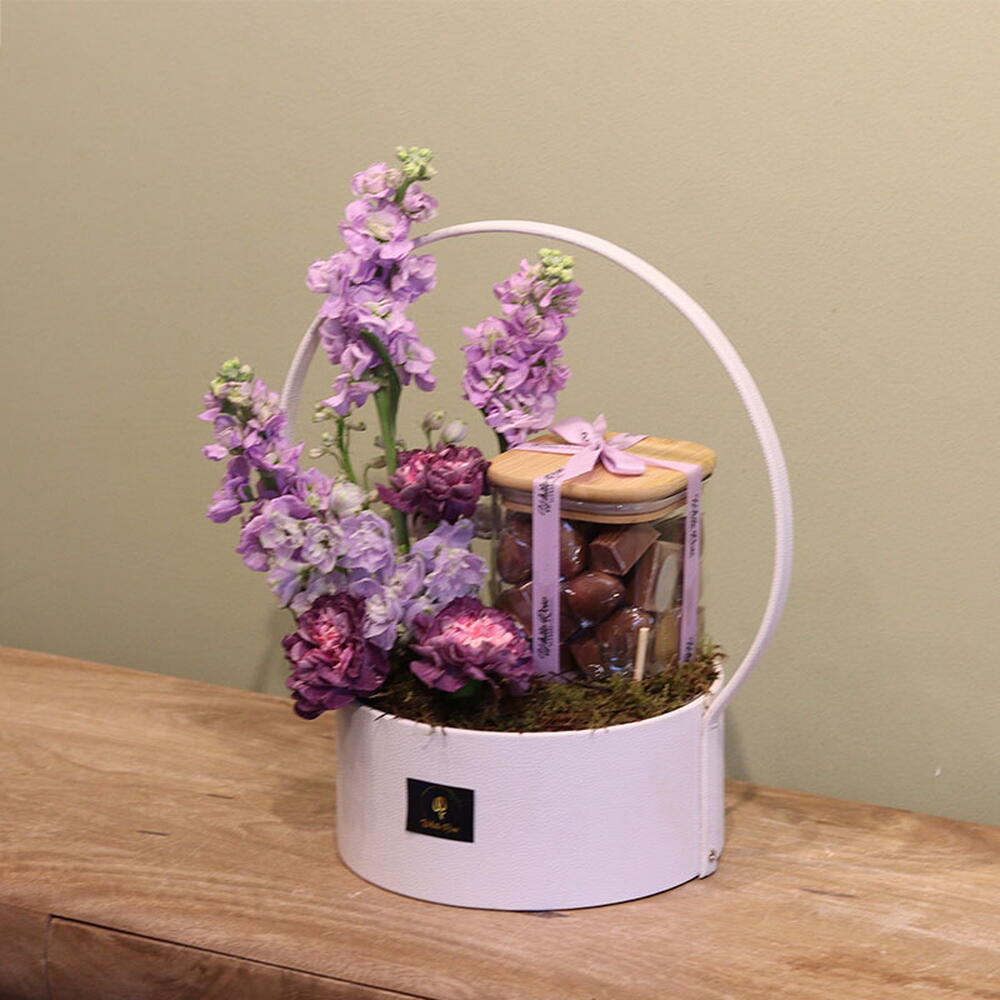 combination of Carnation, Mathiolla and other mix of flowers arranged with 650g Chocolate in a Leather Basket